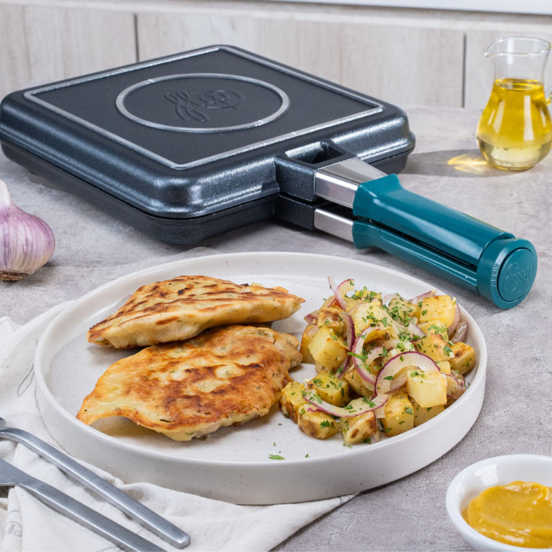 Del otro lado de la Flip 2.2 previamente precalentada, lubricamos apenas la pieza y agregamos las papas cortadas en cubos. Cocinamos hasta dorar de todas sus caras.